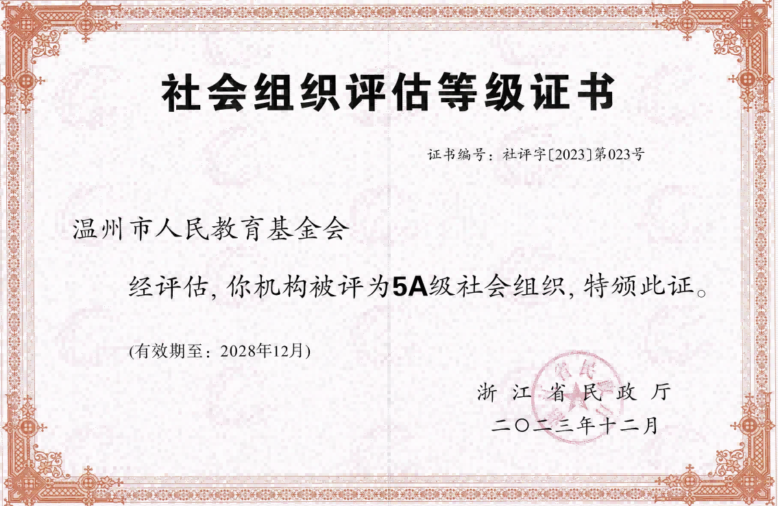 温州市人民教育基金会是由 1989 年 7 月 3 日温州市人民政府发文批准设立,2001 年 8 月 1 日省民政厅注册登记的公募基金会,业务主管单位为浙江省教育厅。2016 年 9 月《中华人民共和国慈善法》正式颁布实施之后,我会于 2017 年 7 月被认定为慈善组织,并获得公开募捐资格。2018、2023 年连续 2 次被浙江省民政厅评为最高等级--AAAAA 级社会组织。2023 年 10 月获得了由温州市人民政府颁发的第四届温州慈善奖的慈善楷模奖。2023 年 10 月荣获浙江省民政厅认定的浙江省品牌社会组织。