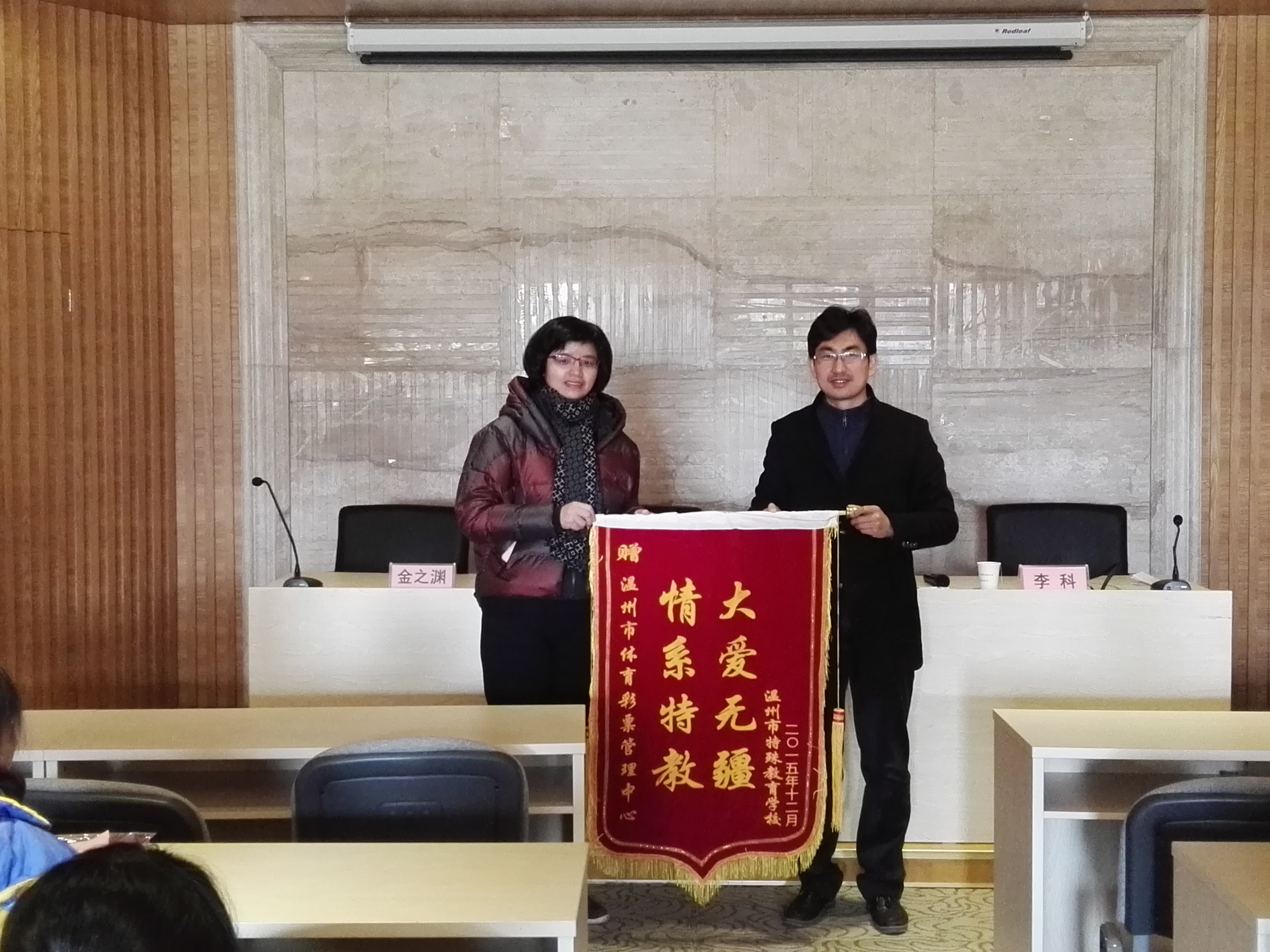 特教学校校长李科向市体彩中心副主任余蓓蕾颁发锦旗表示感谢!