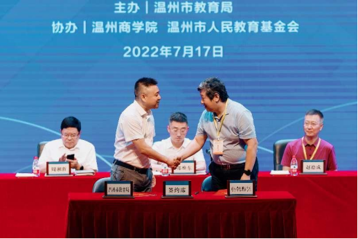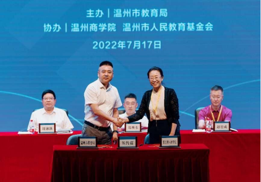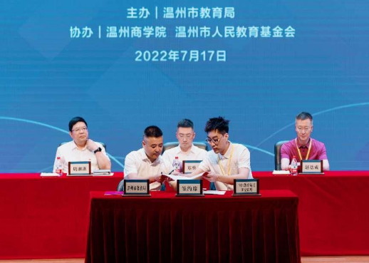 7月17日,温州市瓯越名校长培育专项基金捐赠仪式暨培训班开班仪式在温州商学院举行。温州商学院、温州银行股份有限公司、凯奇集团有限公司分别向温州市人民教育基金会捐赠1000万元,专项支持高中、义务、学前瓯越名校(园)长培育。