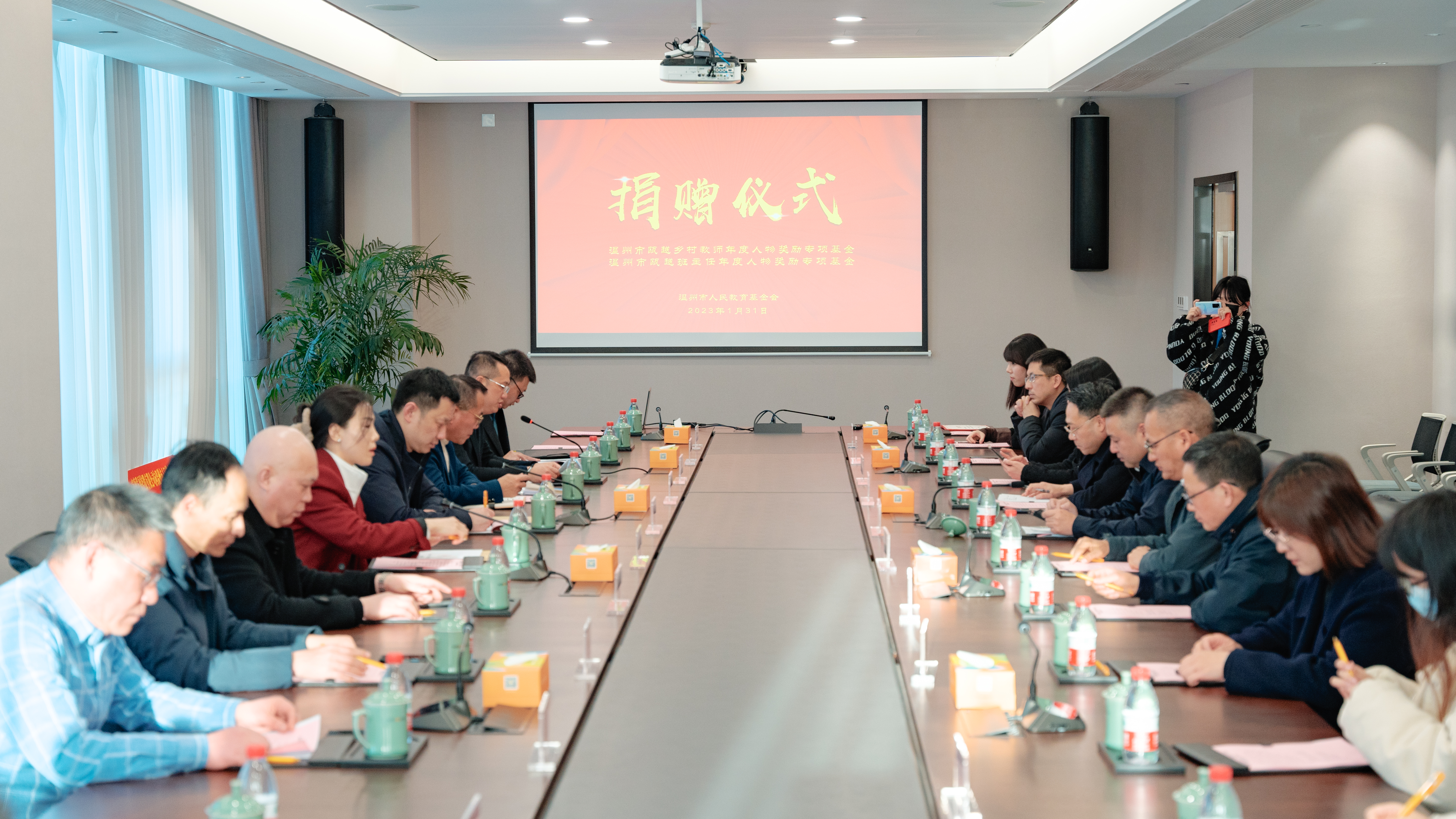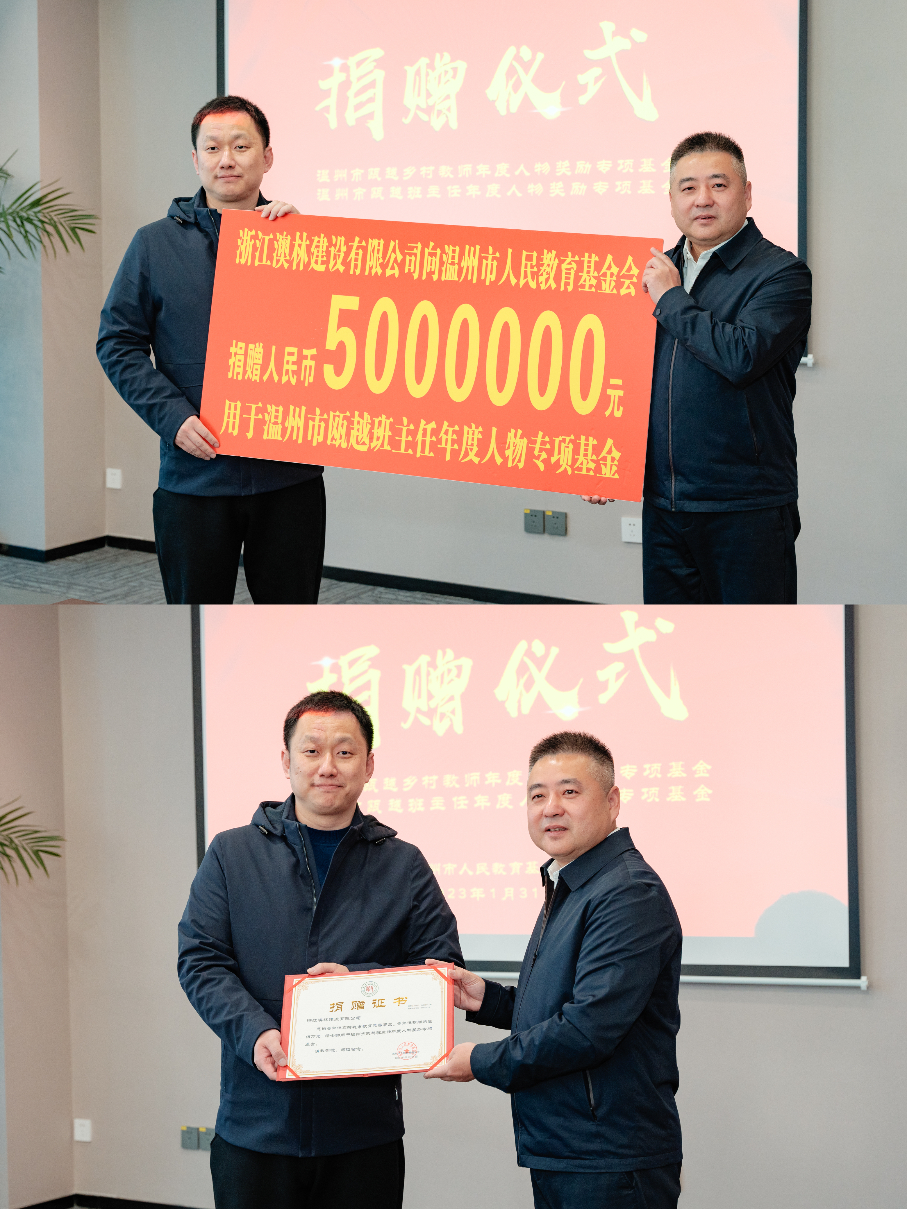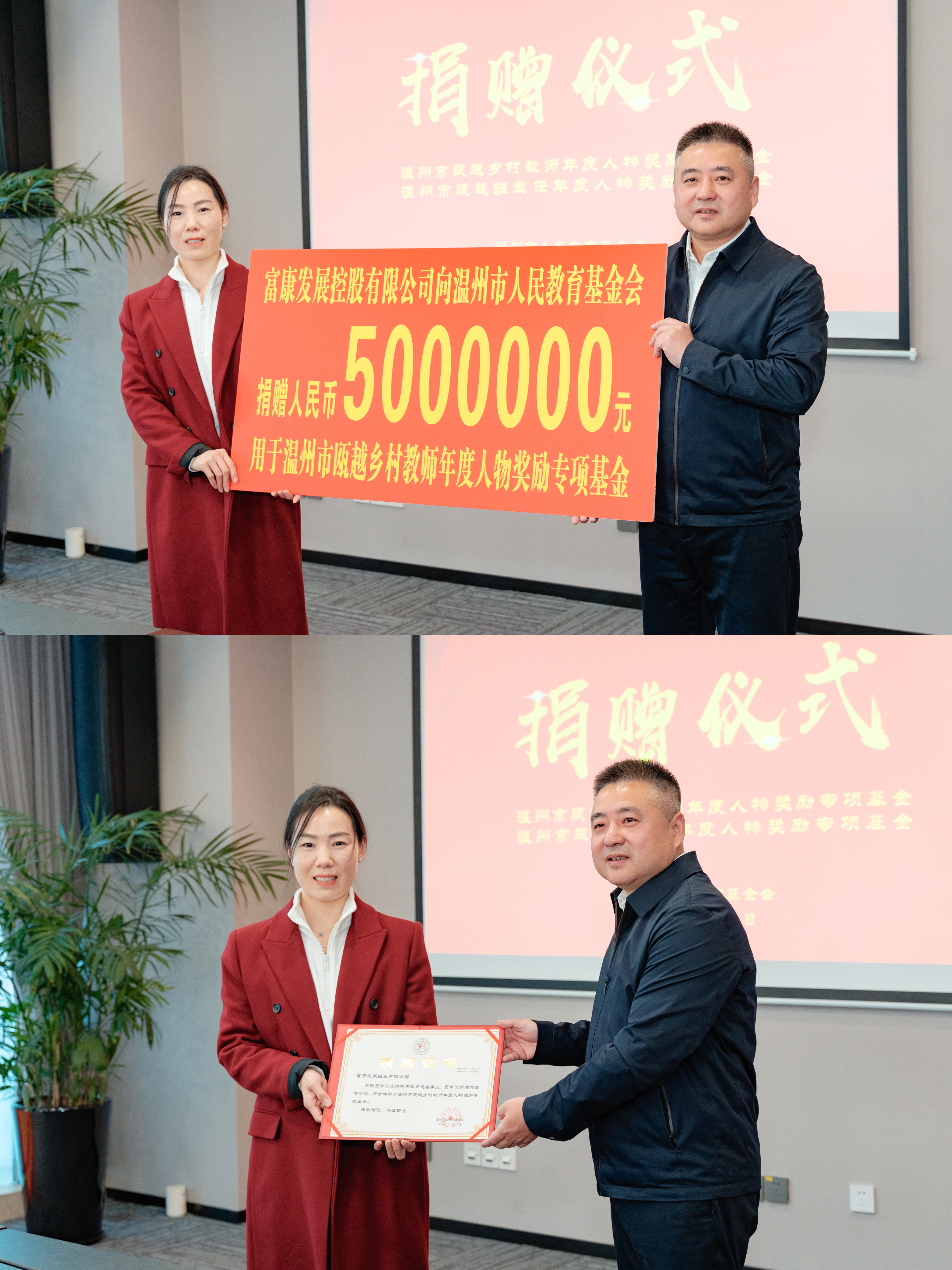 1月31日下午,由温州市人民教育基金会主办的温州市瓯越班主任、乡村教师年度人物奖励专项基金捐赠仪式在温银大厦406会议室顺利举行。富康发展控股有限公司与浙江澳林建设有限公司分别向温州市人民教育基金会捐赠500万元,设立“温州市瓯越班主任年度人物专项基金”和“温州市瓯越乡村教师年度人物奖励专项基金”,用于助力温州中小学班主任和乡村教师成长。温州市委教育工委委员、市教育局党委委员、副局长张维凯,富康发展控股有限公司副总裁柴娟,浙江澳林建设有限公司代表黄东海,市教育局相关处室、市教师教育院、市教育工会、洞头区教育局、市人民教育基金会有关负责同志和新闻媒体人士参加本次会议。