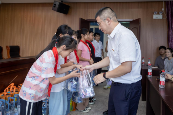 王建宁向茗岙小学教师代表送上了教师节慰问品,致以节日问候,并表示教师是崇高的职业,肩负着立德树人、教书育人的崇高使命,坚守山区的乡村教师们尤为值得尊敬。张海波向学生代表送上学习用品,表达了对孩子们的关爱,希望孩子们能好好学习,树立远大理想,成为自尊、自信、自立、自强的小公民。
