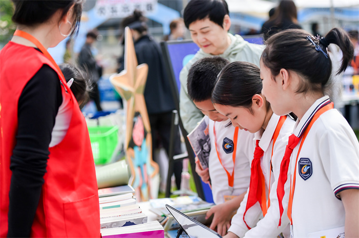 脚步丈量不到的地方,却能踏着书香抵达。第29个世界读书日即将到来,4月20日,由中共温州市鹿城区委宣传部、区文广局、区妇联、城建集团主办,温州市人民教育基金会等单位协办的“鹿阅书香·百变图书馆”绘本市集在滨江街道城市阳台启幕。不少家长带着孩子前来赶集,开启一场小书虫的“历险记”,邂逅阅读之美。活动持续两天。鹿城区委常委、宣传部部长叶恒坚出席活动。