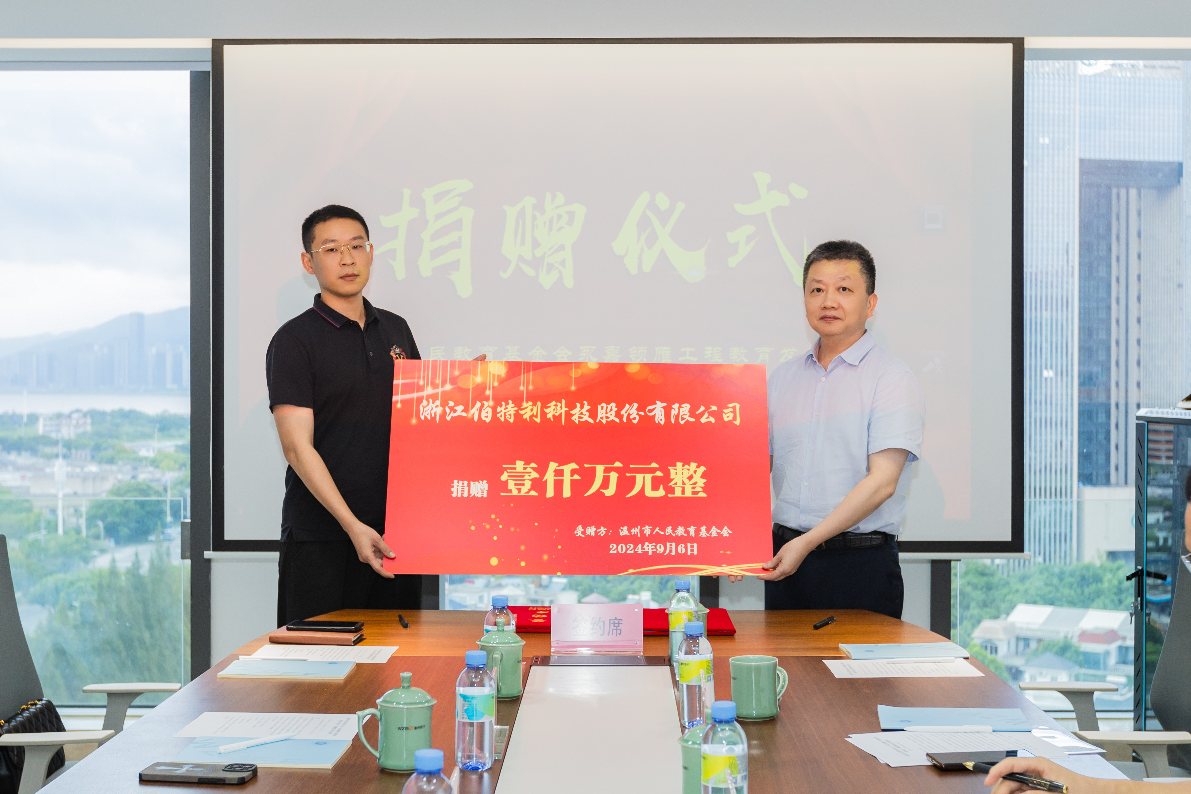 在现场嘉宾见证下,黄聪策总经理和郑为民委员签署温州市人民教育基金会“永嘉领雁工程教育发展专项基金”捐赠协议书。黄聪策总经理代表浙江伯特利科技股份有限公司向温州市人民教育基金会捐赠了共计1000万元的捐赠款项,计划分九年拨付,第一年捐赠200万元,之后每年捐赠100万元。郑为民委员代表温州市人民教育基金会为浙江伯特利科技股份有限公司颁发捐赠证书。